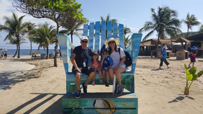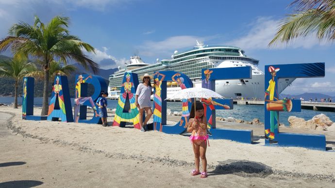 Adriana Matos posing with her son (standing by the letter “B”) and daughter in Labadee, Haiti.