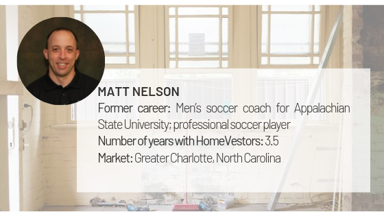 For Matt Nelson, making the transition from a career in playing and coaching soccer to an independently owned and operated HomeVestors® franchisee involved tapping into his recruiting and coaching skills to reinvent himself at a critical time. The former professional soccer player had only made money playing or coaching soccer when his wife suddenly became bedridden early in her pregnancy. Not only did college sports recruiting require significant travel, but Nelson found himself driving back and forth to the hospital up to four hours each day to care for his wife when he asked himself, “what will I do in my next stage of life?”