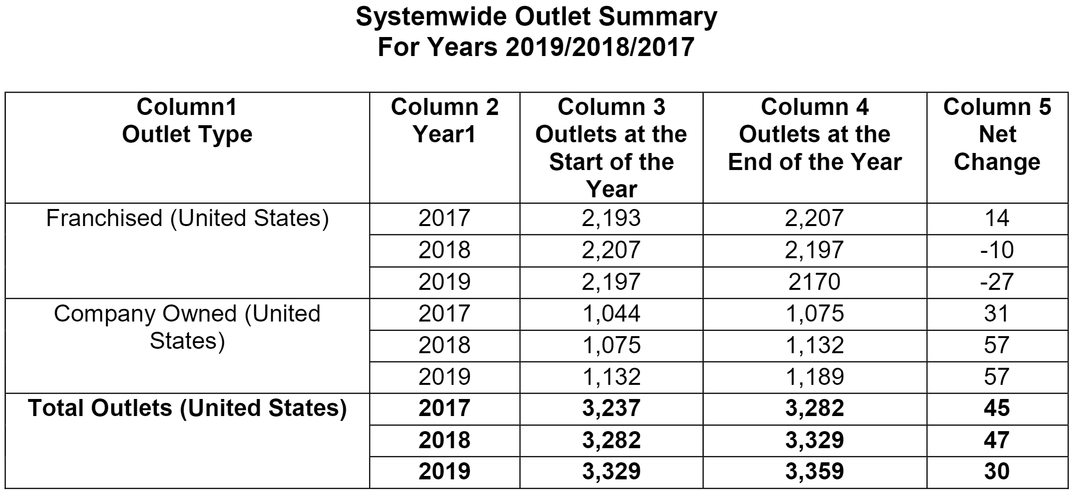 Looking forward, projections from Arby’s 2020 FDD signal a shift as the brand looks to grow its franchise units, with 70 new franchised U.S. outlets and 20 new company-owned outlets forecasted for 2020. How this has actually played out due to the pandemic hitting in March, has yet to be seen.